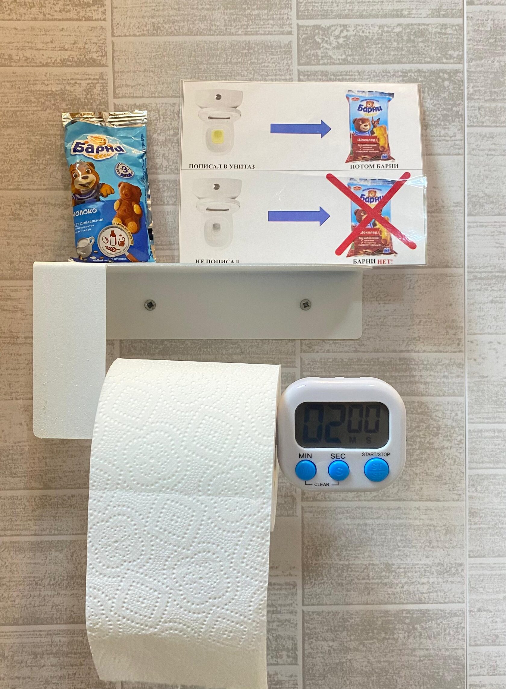 Первой нашей целью было увеличить длительность сидения на унитазе до 2х минут. Для этой цели мы подкрепляли каждое спокойное сидение мишками Барни. Через 2 недели критерий был достигнут - оба мальчика могли в течение 2х минут сидеть на унитазе без убеганий и другого нежелательного поведения.